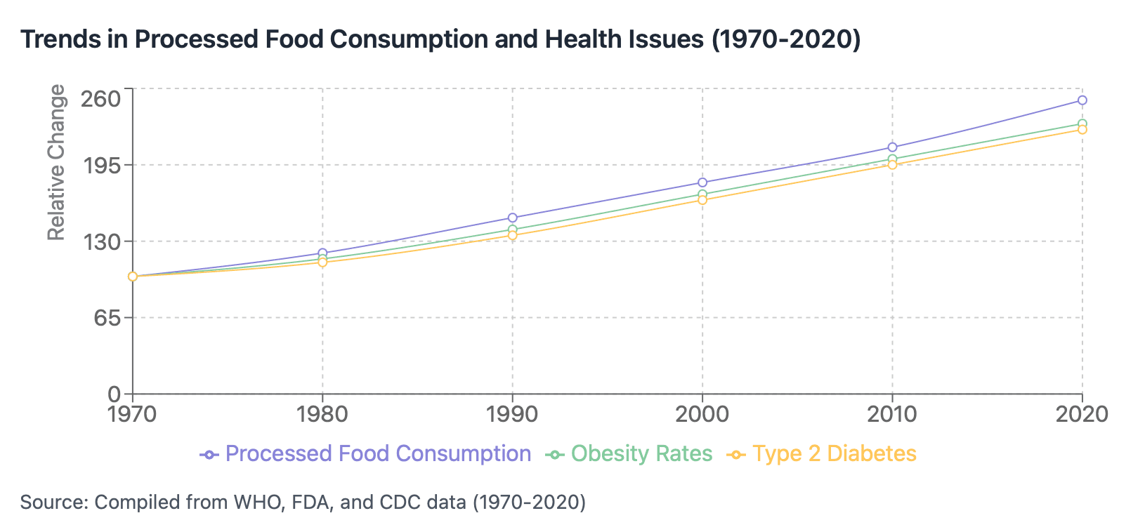 Look at the graph above. Since 1970, we've witnessed an unprecedented shift in how we eat. The rise in processed food consumption (shown in purple) has been meteoric, increasing by 150% over five decades. What's particularly striking is how this trend lines up with major health issues – obesity rates (green) and Type 2 diabetes (yellow) have followed an eerily similar trajectory.